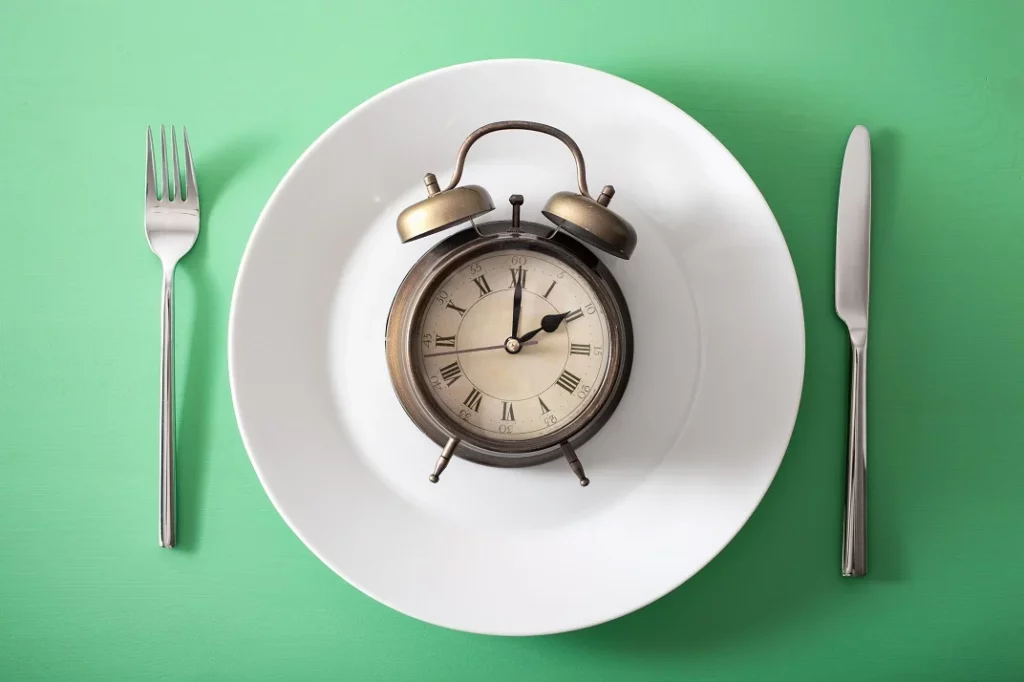 W praktyce intermittent fasting może wyglądać np. tak: jedzenie w godzinach 12:00–20:00, post od 20:00 do 12:00 następnego dnia.